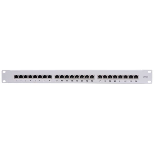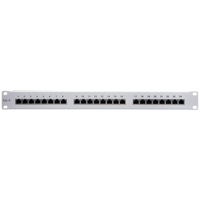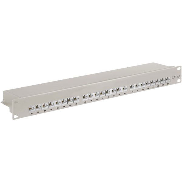 Patch panel κατηγορίας CAT 6 STP, 24 θυρών σε γκρι χρώμα.