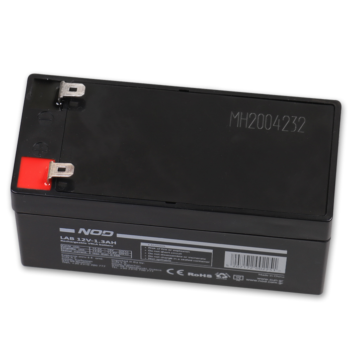 Μπαταρία μολύβδου 12V-1.3AH.Η μπαταρία μολύβδου NOD LAB 12V-1.3AH διασφαλίζει την παροχή αδιάλειπτης ισχύος στον εξοπλισμό σου. Έχει μεγάλη διάρκεια ζωής και χαμηλό βαθμό αυτοεκφόρτισης. Χαρακτηριστικά:- Cycle use: 14.4V – 15V (25°C)- Standby use: 13.6V – 13.8V (25°C)- Τύπος Terminal: F5- Initial current: < 0.39A- Διαστάσεις (ΜxΠxΥ): 97x42x51mm