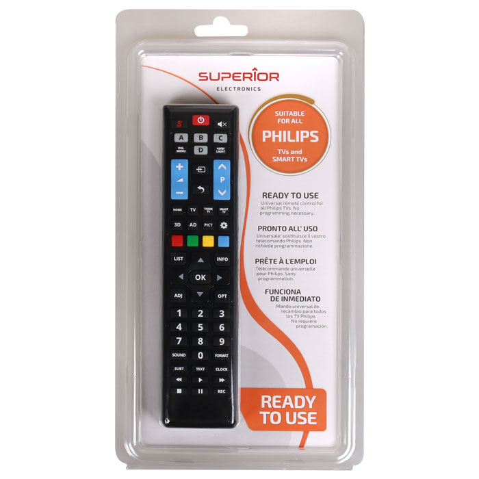 Τηλεχειριστήριο αντικατάστασης για τηλεοράσεις Philips.- Κατάλληλο για όλες τις τηλεοράσεις Philips- Δεν απαιτείται προγραμματισμός- Ισχυρό σήμα- Περιέχει όλες τις λειτουργίες του αυθεντικού τηλεχειριστηρίου- Λειτουργεί με 2 μπαταρίες AAA/LR03 (δεν συμπεριλαμβάνονται) – Συμβατό με όλα τα μοντέλα παραγωγής μετά απο το 2000