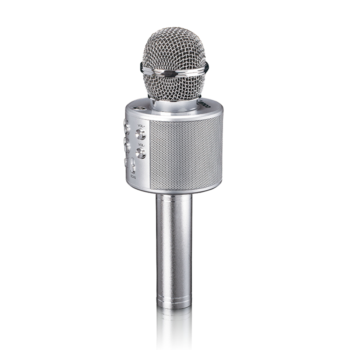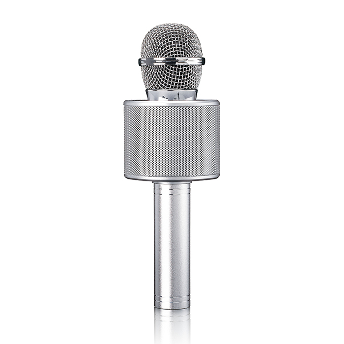 Ασύρματο Bluetooth μικρόφωνο με ενσωματωμένο ηχείο και λειτουργία Karaoke, σε ασημί χρώμα.