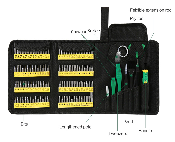 1x screwdriver set (M2.5, M3.0, M3.5, M4.0, M4.5, M5.0, M5.5, G3.8, G4.5, U, 0.8, 1.0, 0.3, 0.1, Pry bar, Scrapper, T1, T2, T3, T4, T5, T6H, T7H, 2x T8H, T9H, T10H, T15H, T20H, T25H, 2x Y000, Y00, Y0000, Y0, Y1, Y2, 3x AP2, 2AP5, AP6, 2.0, 2.0, 3x PH0000, 3x PH000, 2x PH00, 2x PH0, 2x PH1, 2x PH2, PZ0, PZ1, PZ2, 2x SL1.0, 2x SL1.3, SL1.5, SL2.0, SL2.5, SL3.0, SL3.5, SL4.0, SL4.5, SL5.0, 2x H0.7, 2x H0.9, H1.3, H1.5, H2.0, H2.5, H3.0, H3.5, H4.0, H4.5, H5.0, H6.0, U4, U6, U8, U10, 2.0, 2.3, 2.6, 3.0, SQ0, SQ1, SQ2, SQ3, H1/16, H5/64, H3/32, H7/64, H1/8, H9/64, H5/32, H3/16, H4-H1/4