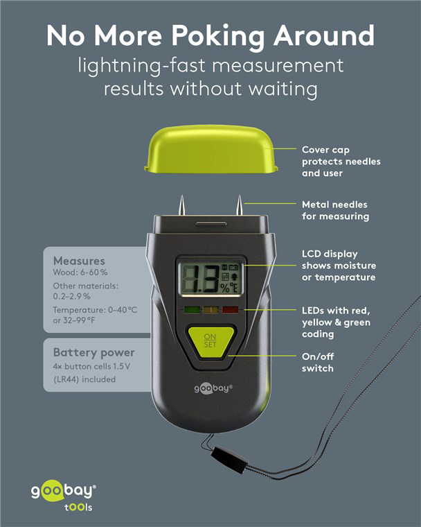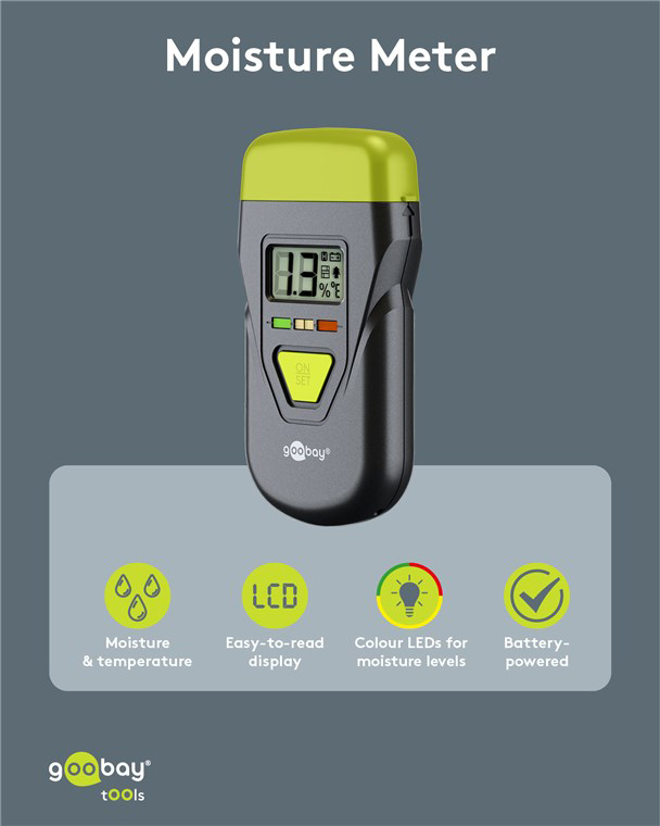 Ψηφιακό θερμόμετρο και υγρασιόμετρο της Goobay, ιδανικό για μέτρηση υγρασίας και θερμοκρασίας σε υλικά όπως ξύλο, μπετόν, τοίχους και άλλα δομικά στοιχεία. Χάρη στον compact σχεδιασμό του, αποτελεί πρακτικό εργαλείο για τεχνικούς, εργασίες ανακαίνισης ή ελέγχους υγρασίας σε εσωτερικούς χώρους.