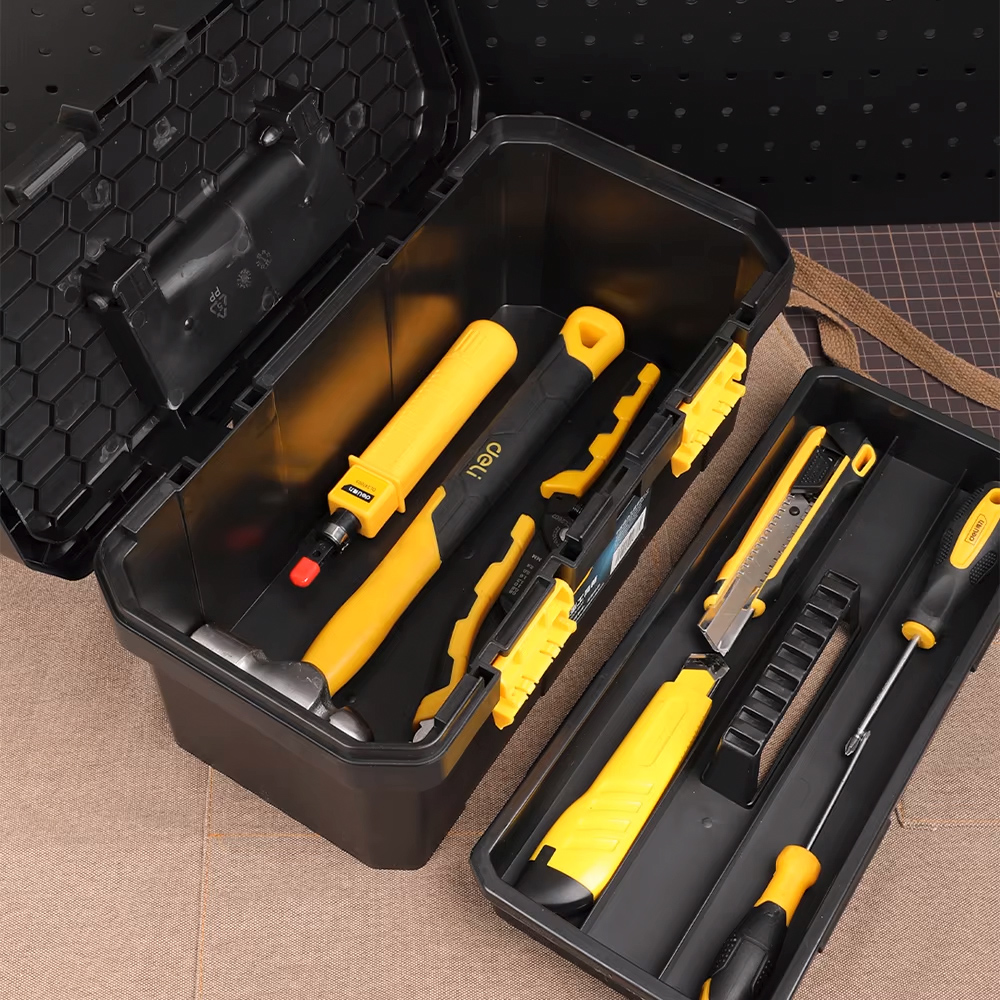 Εργαλειοθήκη της Deli, ιδανική για την αποθήκευση διάφορων εργαλείων και εξαρτημάτων. Διαθέτει εσοχή για ασφάλιση με λουκέτο, ενώ, στο εσωτερικό της διαθέτει δίσκο εργαλείων.