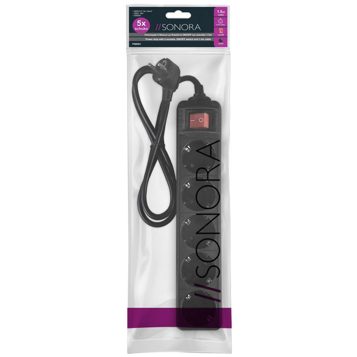Πολύπριζο 5 θέσεων με διακόπτη ON/OFF και καλώδιο 1.5m σε μαύρο χρώμα.Το πολύπριζο SONORA διαθέτει 5 υποδοχές τύπου σούκο για να συνδέσεις έως και 5 ηλεκτρικές συσκευές ταυτόχρονα!Επιπλέον διαθέτει υποδοχές εξοπλισμένες με ασφάλεια για τα παιδιά και διακόπτη ON/OFF για να απενεργοποιείτε το πολύπριζο όταν δεν το χρησιμοποιείτε.Χαρακτηριστικά:Έξοδοι Schuko: 5 με προστασία επαφώνΔιακόπτης: ΝαιΤάση εισόδου: 250VΡεύμα εισόδου: 16AΙσχύς: 3500WΤύπος καλωδίου: H05VV-F 3×1.5mm2Μήκος καλωδίου: 1.5mΧρώμα: ΜαύροΕγγύηση: 2 χρόνιαΑριθμός καταχώρησης: ΗΜΡΡ/00921