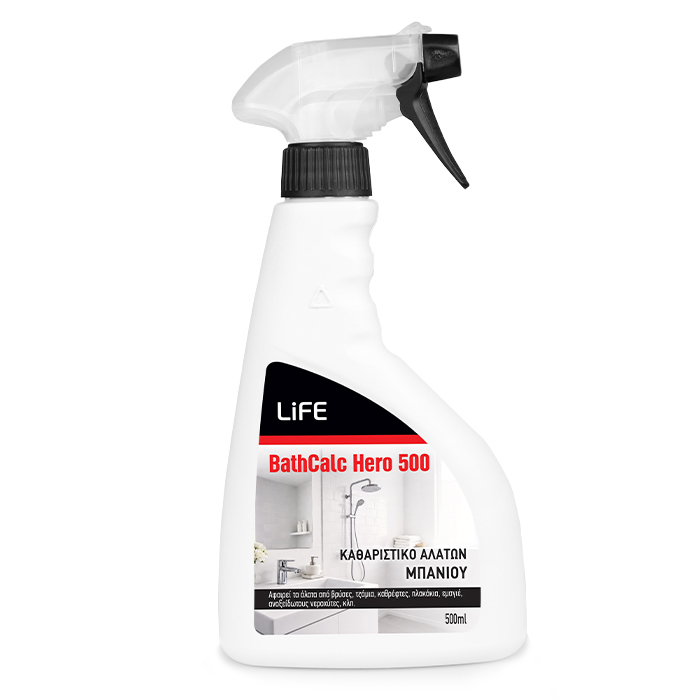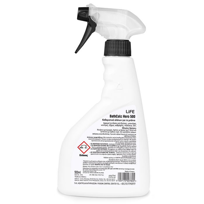 Καθαριστικό αλάτων μπάνιου, 500mlΤο LiFE BathCalc Hero 500 είναι ένα καθαριστικό, κατάλληλο για την αφαίρεση αλάτων από βρύσες, μπανιέρες, νιπτήρες, τζάμια, καθρέφτες, πλακάκια, ανοξείδωτους νεροχύτες, εμαγιέ κλπ.Απομακρύνει τα άλατα από τις επιφάνειες του μπάνιου σε 2 λεπτά δίνοντας καθαριότητα και φρεσκάδα στον χώρο.Διαθέτει κλείδωμα ψεκασμού στο ακροφύσιό του, ώστε να διασφαλίζεται η σωστή και ασφαλής χρήση.Χαρακτηριστικά:- Αφαίρεση αλάτων από βρύσες, μπανιέρες, νιπτήρες, τζάμια, καθρέφτες, πλακάκια, ανοξείδωτους νεροχύτες, εμαγιέ κλπ.- Καθαριότητα του χώρου σε μόλις 2 λεπτά- Ακροφύσιο με κλείδωμα ψεκασμού για ασφαλή χρήση- Συσκευασία: 500mlΗ τιμή αναφέρεται στο 1 τεμάχιο, ελάχιστη παραγγελία 6 τεμάχια ή πολλαπλάσια.Δηλώσεις επικινδυνότητας:Προκαλεί σοβαρά δερματικά εγκαύματα και οφθαλμικές βλάβες.Δηλώσεις προφυλάξεων:o Μην αναπνέετε σκόνη/αναθυμιάσεις/αέρια/σταγονίδια/ ατμούς/εκνεφώματα. o Πλύνετε τα χέρια σχολαστικά μετά το χειρισμό. Να φοράτε προστατευτικά γάντια/προστατευτικά ενδύματα/ μέσα ατομικής προστασίας για τα μάτια/το πρόσωπο/τα αυτιά. ΣΕ ΠΕΡΙΠΤΩΣΗ ΚΑΤΑΠΟΣΗΣ: Ξεπλύνετε το στόμα. ΜΗΝ προκαλέσετε εμετό.ΣΕ ΠΕΡΙΠΤΩΣΗ ΕΠΑΦΗΣ ΜΕ ΤΟ ΔΕΡΜΑ (ή με τα μαλλιά):o Βγάλτε αμέσως όλα τα μολυσμένα ρούχα.o Ξεπλύνετε την επιδερμίδα με νερό (ή στο ντους)ΣΕ ΠΕΡΙΠΤΩΣΗ ΕΙΣΠΝΟΗΣ: Μεταφέρατε τον παθόντα στον καθαρό αέρα και αφήστε τον να ξεκουραστεί σε στάση που διευκολύνει την αναπνοή.ΣΕ ΠΕΡΙΠΤΩΣΗ ΕΠΑΦΗΣ ΜΕ ΤΑ ΜΑΤΙΑ: o Ξεπλύνετε προσεκτικά με νερό για αρκετά λεπτά. Αν υπάρχουν φακοί επαφής, αφαιρέστε τους, αν είναι εύκολο. o Συνεχίστε να ξεπλένετε.o Καλέστε αμέσως το ΚΕΝΤΡΟ ΔΗΛΗΤΗΡΙΑΣΕΩΝ/γιατρό.Χρειάζεται ειδική αγωγή (βλέπε στην ετικέτα).Πλύνετε τα μολυσμένα ενδύματα πριν τα ξαναχρησιμοποιήσετε. Φυλάσσεται κλειδωμένο,Διάθεση περιεχομένου/περιέκτη σε σημεία συλλογής επικίνδυνων ή ειδικών αποβλήτων.Κρατήστε το προϊόν ΜΑΚΡΙΑ ΑΠΟ ΤΑ ΠΑΙΔΙΑΠεριέχει: Poly (ethylene oxide) mono-2-propylheptyl etherΠεριεχόμενο σε συμφωνία με τον κανονισμός (EK) αριθ. 648/2004 σχετικά με τα απορρυπαντικά:Μη ιονικές επιφανειοδραστικές ουσίες <5%Φωσφονικές ενώσεις <5%συντηρητικά: BENZALKONIUM CHLORIDEUFI: V800-S0AJ-Y008-TX4JΤΗΛ. ΚΕΝΤΡΟ ΔΗΛΗΤΗΡΙΑΣΕΩΝ / POISON CONTROL CENTER TEL.: +30 210 7793777