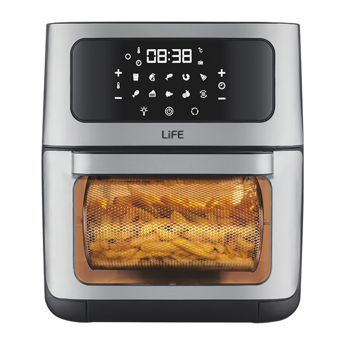 Φριτέζα αέρος 12L, με ψηφιακή οθόνη LED, γυάλινη πόρτα και φωτιζόμενο κάδο, 1800W.Η LiFE Fried Gold σας παρέχει υγιεινό, γρήγορο κι εύκολο μαγείρεμα με ασφάλεια, κι επιπλέον προσφέρει σημαντικά πλεονεκτήματα σε σχέση με τις περισσότερες φριτέζες αέρος της αγοράς λόγω:- Του XXL βαθύ αποσπώμενου κάδου της- Των λειτουργιών που ενσωματώνει- Την πληθώρα των εξαρτημάτων- Του παραθύρου και του εσωτερικού φωτισμού που σας δίνει άμεση θέαση στον κάδο του φαγητού.Με ισχύ 1800W, XXL πλήρως εκμεταλλεύσιμη χωρητικότητα κάδου 12L και λειτουργία ζεστού αέρα για υγιεινό τηγάνισμα με ελάχιστο ή καθόλου λάδι, θα γίνει το απαραίτητο και καθημερινό εργαλείο για τη μαγειρική σας. Η λειτουργία με ζεστό αέρα σας προσφέρει το αποτέλεσμα του τηγανίσματος, χωρίς τη λιπαρότητα και τις θερμίδες του λαδιού.Η LiFE Fried Gold διαθέτει πρακτικό και σύγχρονο σχεδιασμό, με μεγάλη LED οθόνη με πλήκτρα αφής, απ’ όπου μπορείτε να επιλέξετε ένα από τα 9 προ-ρυθμισμένα προγράμματα μαγειρέματος ανάλογα με τον τύπο του γεύματος σας! Μαγειρέψτε το αγαπημένο σας φαγητό χωρίς να ψάχνετε τις ρυθμίσεις που χρειάζονται! Διαθέτει επιπλέον και την πάντα χρήσιμη λειτουργία για ζέσταμα και απόψυξη.Το γυάλινο παράθυρο του κάδου και ο φωτισμός στο εσωτερικό του (διαθέτει πλήκτρο ενεργοποίησης του φωτισμού), σας επιτρέπουν να παρακολουθείτε την πρόοδο του μαγειρέματος, χωρίς να χρειάζεται να ανοίγετε τον κάδο, κάτι το οποίο θα σήμαινε απώλεια θερμότητας και συνεπώς επιμήκυνση του χρόνου μαγειρέματος και υψηλότερη κατανάλωση ενέργειας.Σε περίπτωση που δεν θέλετε να στηριχτείτε στα προ-ρυθμισμένα προγράμματα, αλλά θέλετε να επιλέξετε εσείς τον χρόνο και την θερμοκρασία μαγειρέματος, το μόνο που έχετε να κάνετε είναι να επιλέξετε την απαιτούμενη θερμοκρασία γεύματος (ρυθμιζόμενη θερμοκρασία ψησίματος 40°C – 200°C) και τον απαιτούμενο χρόνο ψησίματος ανάλογα με τον τύπο του γεύματος. Όταν το μαγείρεμα τελειώσει, η LiFE Fried Gold θα τερματίσει αυτόματα τη λειτουργία της και θα σας ειδοποιήσει με ένα ηχητικό σήμα.Ο κάδος χωρητικότητας 12L είναι αποσπώμενος και με αντικολλητική επίστρωση για εύκολο καθάρισμα και διαθέτει θερμομονωμένη λαβή για ασφαλή χειρισμό, Η LiFE Fried Gold έρχεται με μια μεγάλη ποικιλία από χρήσιμα αξεσουάρ, όπως 10 σουβλάκια (ή καλαμάκια – όπως προτιμάει να τα λέει ο καθένας), περιστρεφόμενη σούβλα, κυλινδρικό περιστρεφόμενο καλάθι για τηγανητές πατάτες, δίσκο συλλογής λαδιού, διχτυωτή σχάρα ψησίματος, διάτρητο ταψί ψησίματος και λαβή τοποθέτησης & αφαίρεσης του περιστρεφόμενου καλαθιού και της σούβλας. Όλα αυτά τα αξεσουάρ μπορούν να πλυθούν στο πλυντήριο πιάτων!Τέλος, η LiFE Fried Gold διαθέτει επίσης προστασία υπερθέρμανσης και θερμομονωμένο εξωτερικό περίβλημα για μέγιστη ασφάλεια.Χαρακτηριστικά:- Λειτουργία ζεστού αέρα για υγιεινό τηγάνισμα με ελάχιστο ή καθόλου λάδι- ΧXL βαθύς αποσπώμενος κάδος (ΜxΠxΥ: 244 x 238 x 100 mm) με αντικολλητική επίστρωση και θερμομονωμένη λαβή – Χωρητικότητα: 12L- LED οθόνη με πλήκτρα αφής- 9 προ-ρυθμισμένα προγράμματα μαγειρέματος- Λειτουργία για ζέσταμα και απόψυξη- Παράθυρο για έλεγχο προόδου του μαγειρέματος- Εσωτερικός φωτισμός – Ρυθμιζόμενη θερμοκρασία ψησίματος 40°C – 200°C- Ρυθμιζόμενος χρονοδιακόπτης έως 90 λεπτά με ηχητική ειδοποίηση λήξης- Λειτουργία αυτόματης απενεργοποίησης, όταν ολοκληρωθεί ο χρόνος μαγειρέματος- Προστασία υπερθέρμανσης- Θερμομονωμένο εξωτερικό περί