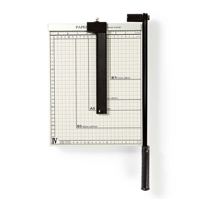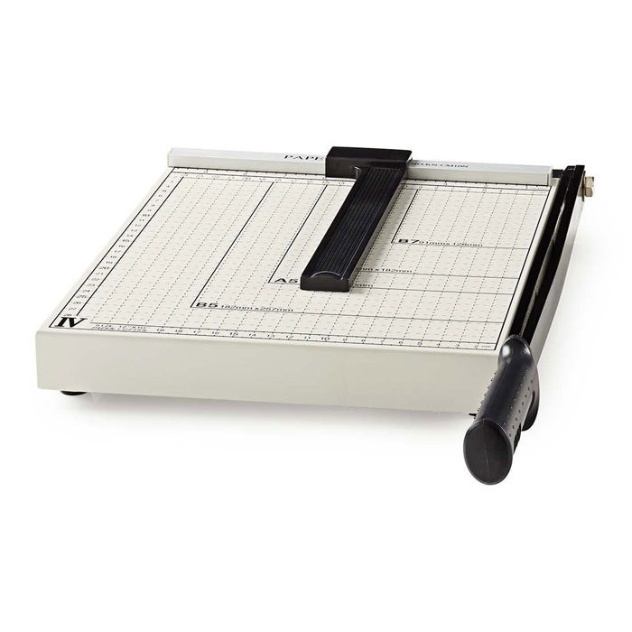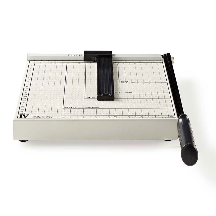 Επαγγελματικό μαχαίρι για κόλλες με μέγιστο μέγεθος A4. – Προσχεδιασμένες και τυπωμένες διαστάσεις μεγέθους (Β5, Α5, Β6, Β7) επάνω στην πλάκα, για βέλτιστο αποτέλεσμα – Ρυθμιζόμενος οδηγός κοπής για μέγιστη ακρίβεια στο κόψιμο – Μέγιστο Μέγεθος χαρτιού: A4 – Διαστάσεις επιφάνεια κοπής: 210 x 297 mm – Χρώμα: Μαύρο / Ασημί – Υλικό: Μέταλλο – Συνολικό μέγεθος μαχαιριού: 250 x 300 mm